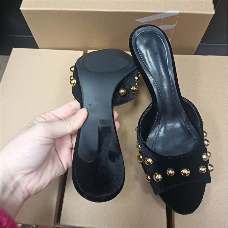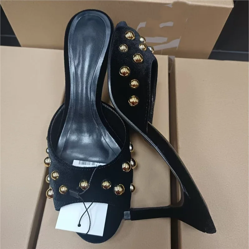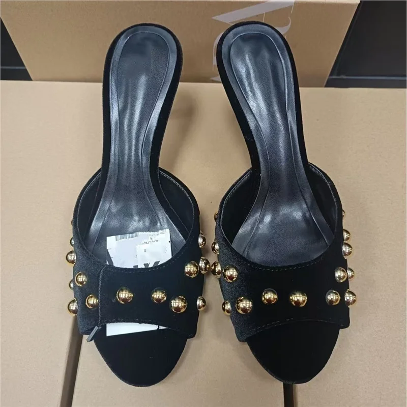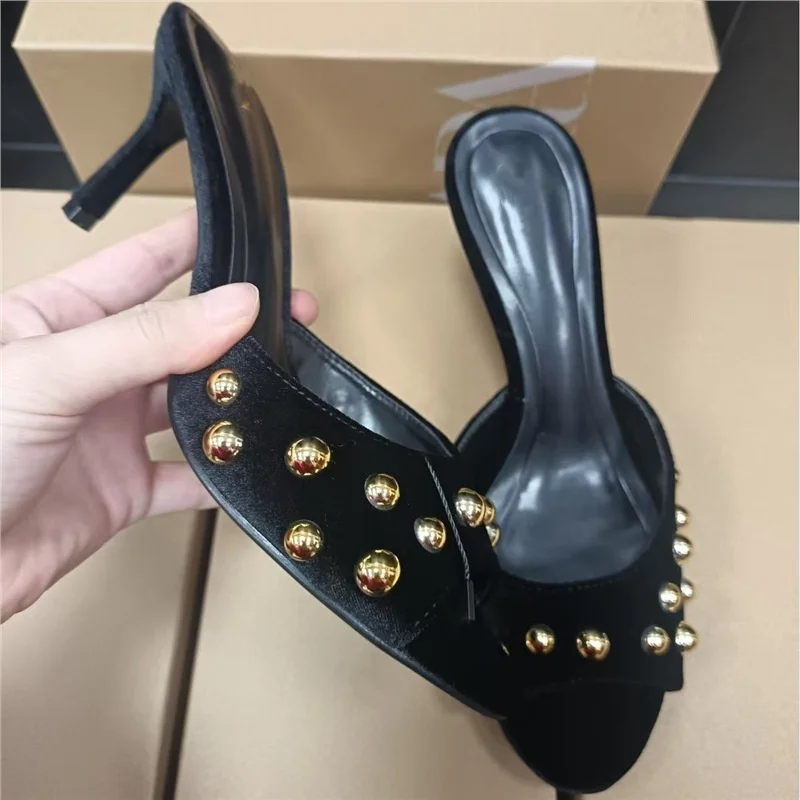 QuiteS 2026 New Black Suede Metal Stud Open-Toe Stiletto Heels Rubber Sandals Casual Sexy Shoes for Women